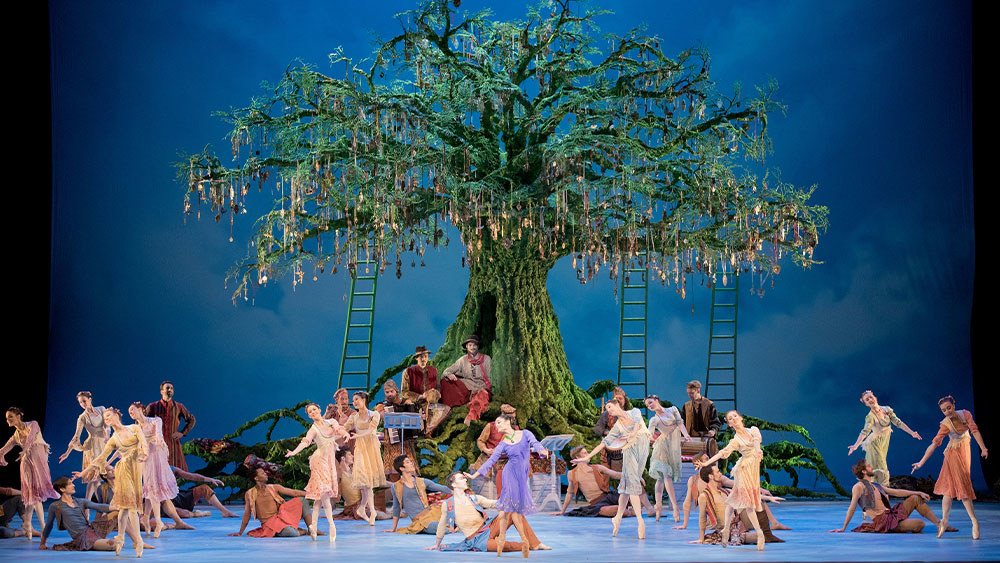 Joby Talbot’s original score for Christopher Wheeldon’s The Winter’s Tale includes five musicians who join the action onstage. This eclectic “banda” plays instruments from around the world – an Indian bansuri flute, Hungarian hammer dulcimer, West African krin and dundun drums, a Brazilian surdo drum, a Middle Eastern riq tambourine, Turkish finger cymbals and an accordion. The group not only provides accompaniment for the dancers but is also integral to the visual life and storytelling of the ballet.