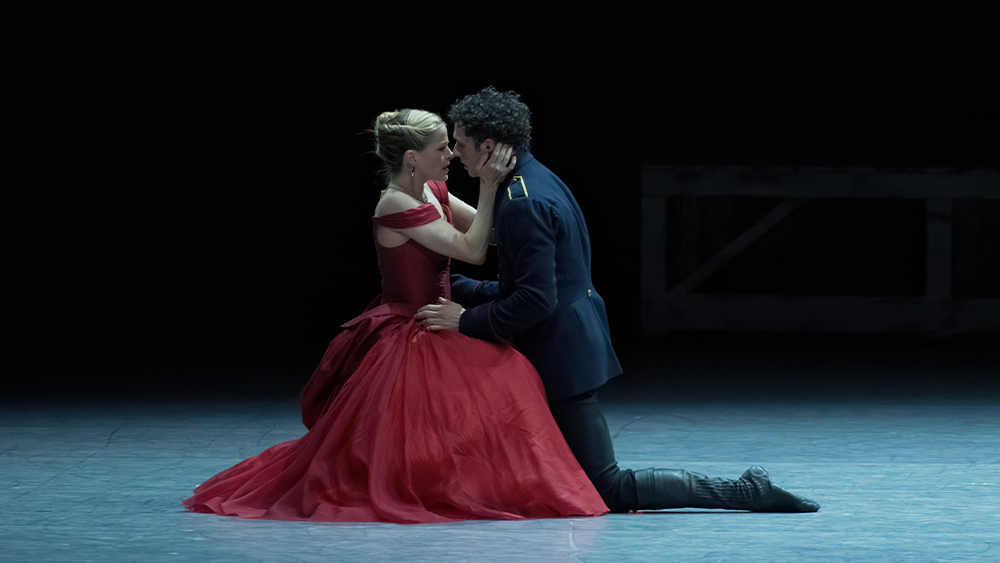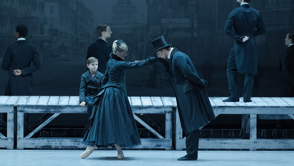The severity of Anna’s consequences, compared with Vronsky’s relative freedom, made a lasting impression on Christian when he first encountered the story as a teenager. That sense of injustice drives this production, which premiered with Ballet Zürich in 2014 and features opulent period costumes by Emma Ryott, minimalist sets by Christian and Jörg Zielinski, and ominous film footage of trains by Tieni Burkhalter that foreshadow Anna’s fate.