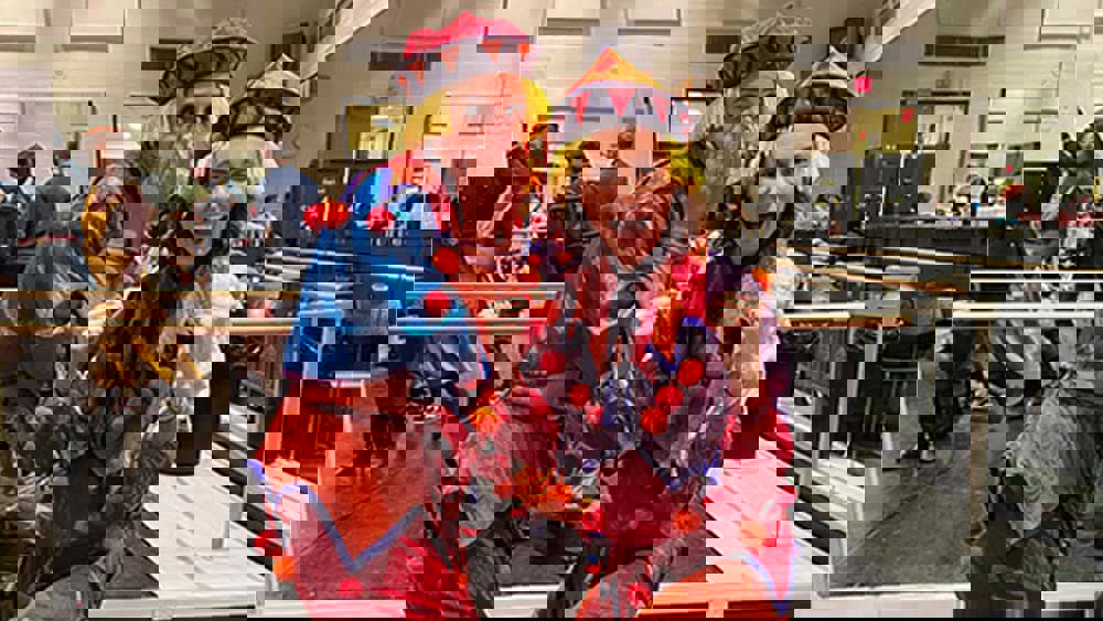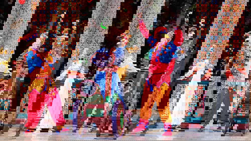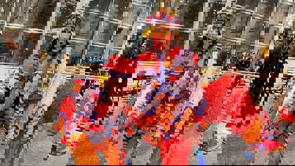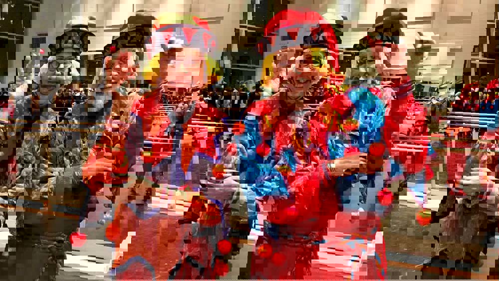 The Cannon Dolls appear midway through Act I flanking a company dancer who fires a confetti-filled cannon into the audience, the start of an epic battle between The Nutcracker and the Mouse Tsar. Dressed almost identically in colourful costumes and hats, the Cannon Dolls are distinguished by their personalities – one is timid, the other full of bravado. This duality is a convention common to children’s stories and the only hard and fast rule that guest performers must follow, apart from their spacing onstage. The Cannon Dolls decide for themselves how to behave and interact within this framework, often spontaneously, and the results are always a highlight of the show.